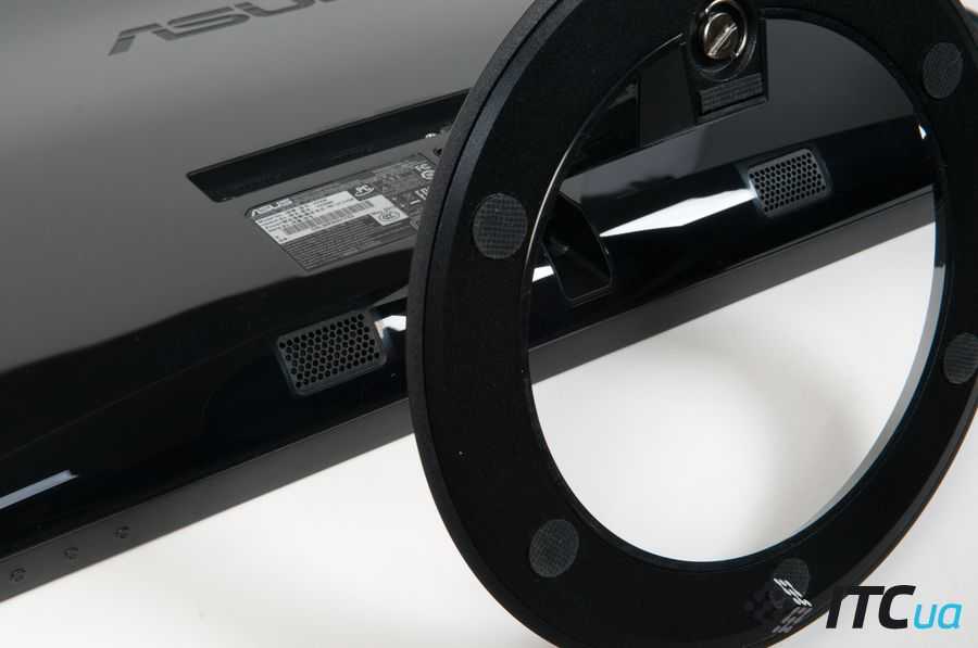 Снизу экран поддерживается планкой из матового пластика, на которой по центру расположено лого ASUS, слева – логотипы использованных в мониторе технологий, а справа – неприметные обозначения над управляющими кнопками.