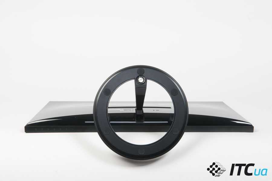 Подставка – круг с матовой внешней поверхностью и глянцевой внутренней, дисплей к ней крепится жесткой ножкой, позволяющей регулировать лишь угол наклона экрана (других степеней свободы – поворота вокруг оси, изменения высоты, перевода в портретный режим – тут нет). Подставка стоит на шести прорезиненных ножках, что значительно снижает вероятность проскальзывания по столу. В целом конструкция средней жесткости, при нажатии на кнопки экран качается очень слабо.