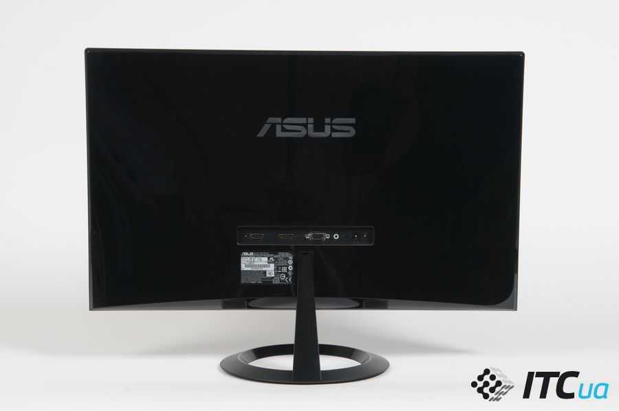 Тыльная сторона монитора чуть выпуклая, из черного глянцевого пластика, возможности крепления на стену здесь не предусмотрено. В нижней части по бокам от ножки расположены встроенные динамики – звучат они ожидаемо тихо, однако довольно неплохо как для своих размеров.