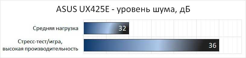 Шума в простое/лёгких нагрузках или автономном режиме Asus UX425E не издаёт совсем. Можно расслышать работу системы охлаждения при подключенной сети и тяжёлой нагрузке, особенно заметен он при выставленном режиме высокой производительности, когда вентиляторы работают на больших оборотах. Но всё равно речь идёт об уровне в 36 Дб, который можно считать вполне комфортным для работы.
