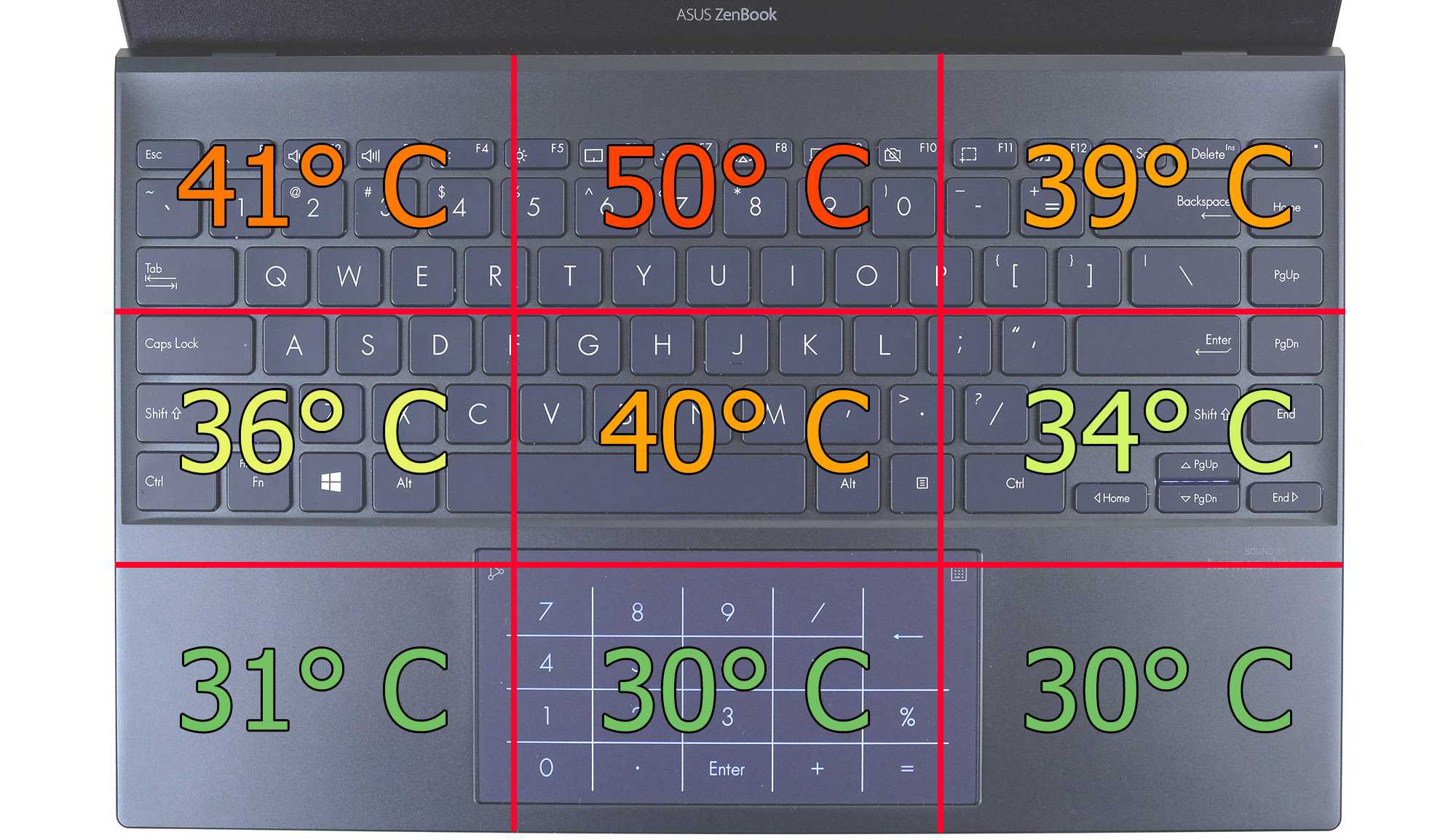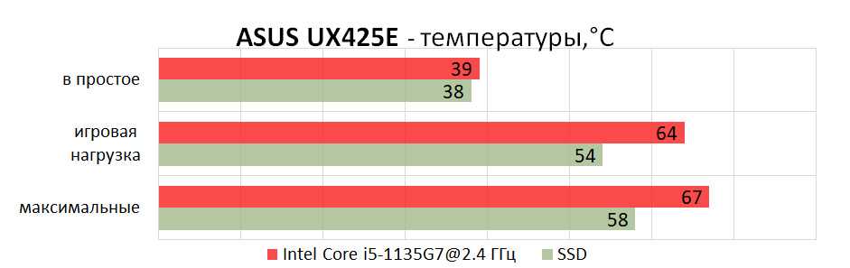 Поскольку прямая специализация Asus UX425E – экономия энергии, больших температур нагрева ждать не приходится. Корпус очень тонкий, но зато металлический и помогает эффективно рассеивать внутреннее тепло. Рабочая область при средних нагрузка не имеет участков с температурами выше 40° C, а прогреть до максимальных 50° C корпус получилось только после получаса игры в Ведьмака 3.