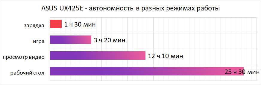 Компактный и сверхлёгкий лэптоп просто обязан работать достаточно долго, и Asus UX425E при весе всего в 1,17 кг здесь исключением не становится. При половинной яркости дисплея в режиме рабочего стола он может проработать больше суток, что можно считать отличным показателем на сегодня. При веб-серфинге или просмотре видео онлайн можно смело рассчитывать минимум на 10 часов работы.