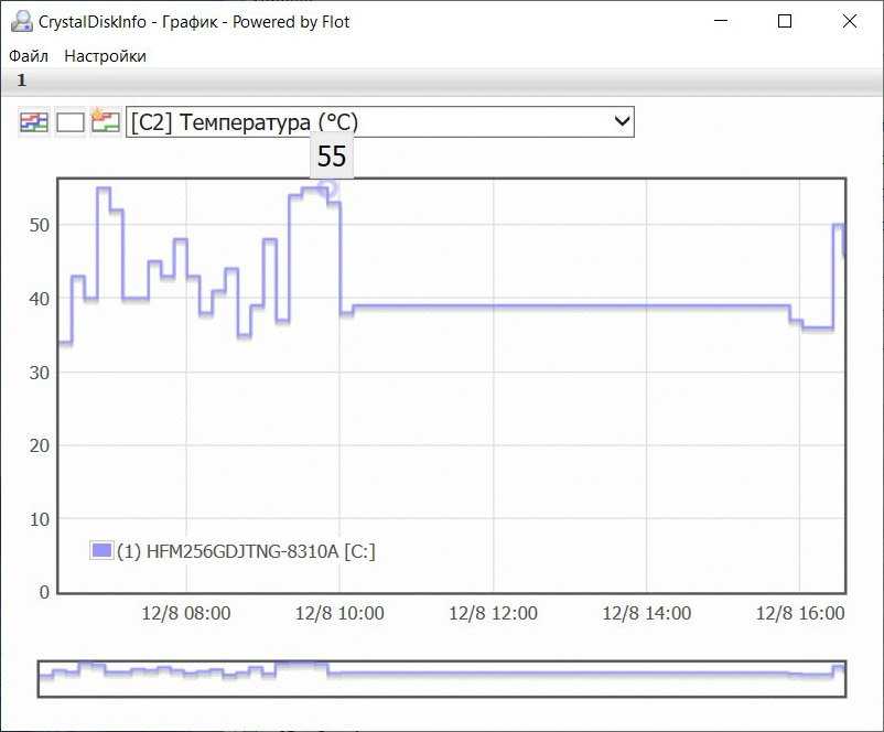При этом комплектующие тоже греются в рамках разумного. Процессор вообще не отличается высоким тепловыделением – в максимуме удалось увидеть значения не выше 67° C. Из-за узкого корпуса достаточно заметно нагревается SSD накопитель – это происходит синхронно с нагревом процессора. Но температуры также остаются в пределах нормы для формата M.2.