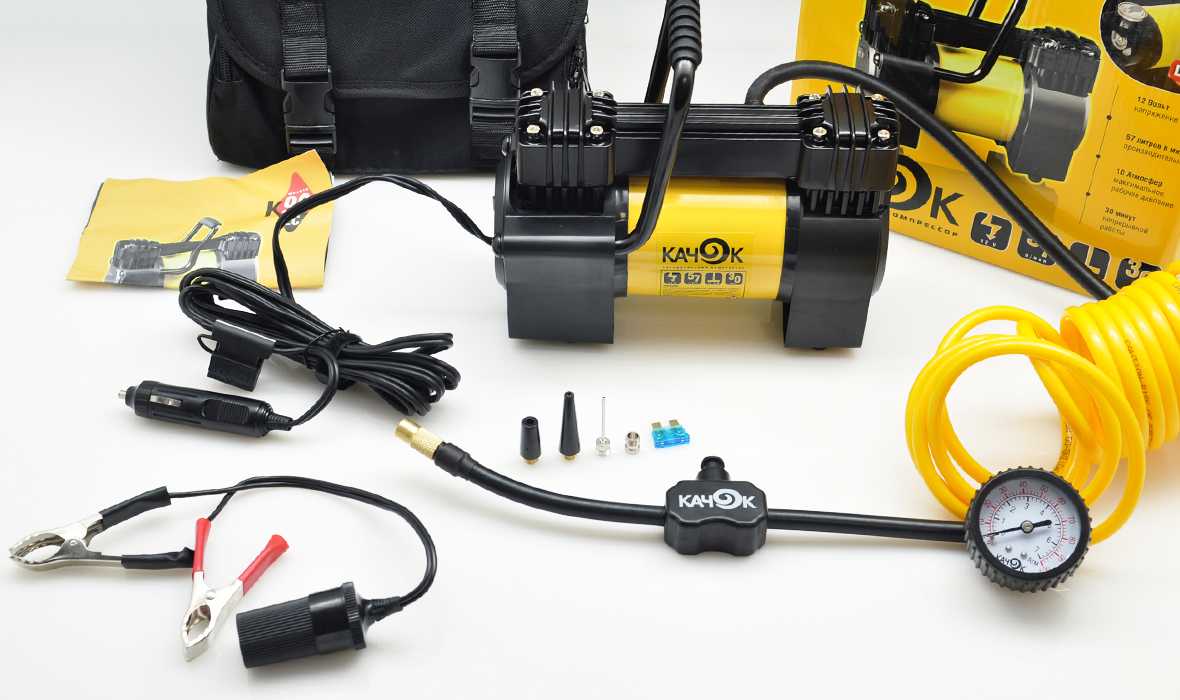 Компрессор питают от прикуривателя. Он может работать непрерывно около 30 минут. В него встроен стрелочный манометр. Кроме того, комплект оснащен дополнительными переходниками.