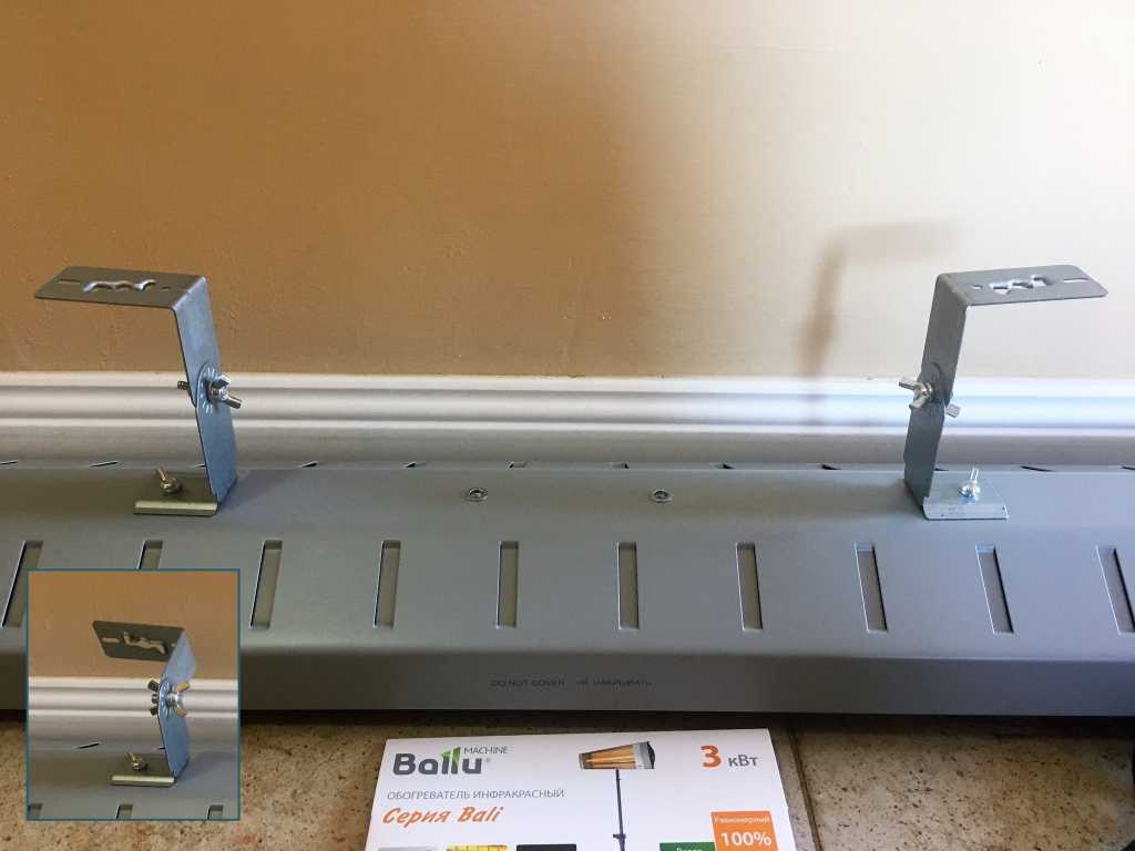У обогревателя в комплекте есть кронштейны для настенного и подвесного монтажа, с возможностью регулирования угла наклона, так же отдельно можно приобрести штатив.