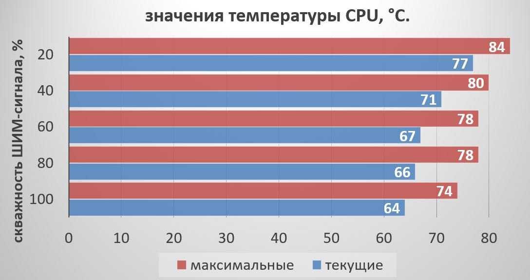 В таблице для удобства восприятия и из-за разных характеристик вентиляторов приводятся значения именно в процентах заполнения ШИМ, а не в об/мин.