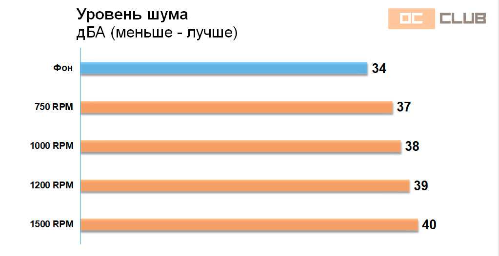 Большое межрёберное расстояние благостно сказалось на эффективности охлаждения с уменьшением оборотов. Даже при едва различимых по шуму 750 оборотах в минуту он оказался достаточно мощным для разогнанного процессора.