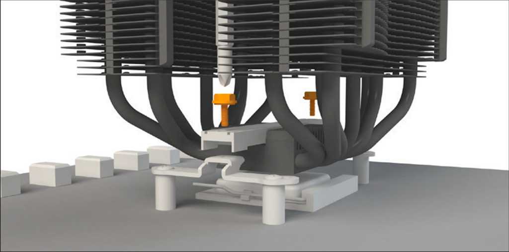 Прижимная пластина с двумя винтами встроена непосредственно в основание кулера. Над винтами пластины радиатора укорочены, образовано окно для отвертки.