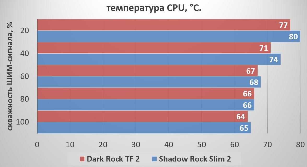 Кулер хорошо справляется с отводом тепла от тестового процессора. На средних оборотах температура не поднимается выше 70, с максимальными пиками — до 80 °С.