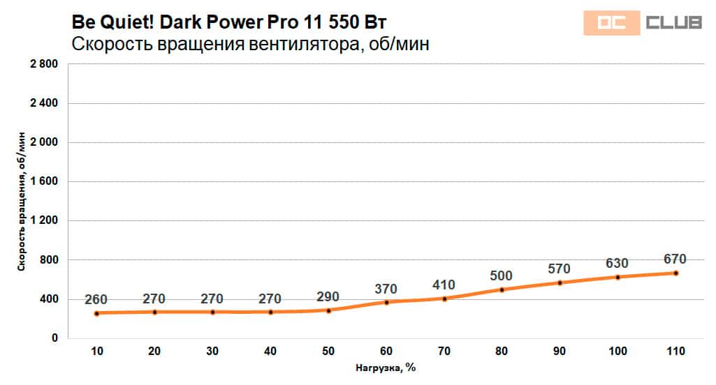 Как правило, блок питания является одной из самых шумных комплектующих в ПК. К сожалению, измерить уровень шума в децибелах не представляется возможным. Рёв вентиляторов нагрузочного стенда умножает все эти попытки на ноль, как вблизи, так и на более удалённых расстояниях. Поэтому на графиках приведены показатели скорости вращения вентилятора. 120-140 мм вентилятор становится различим (но очень тихо) примерно с 1000 об/мин, 1500 об/мин – отчётливо слышен (в условиях открытого стенда).