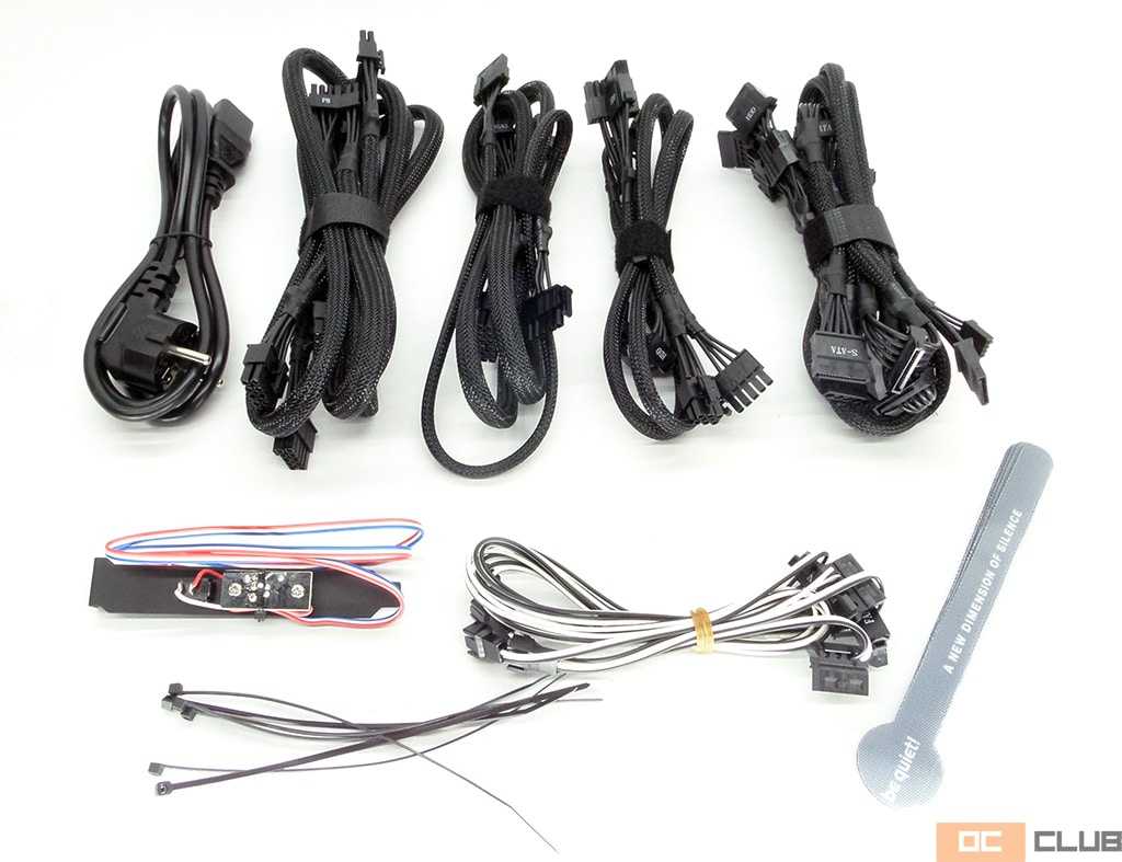 Внутри сам блок питания лежит в мягкой форме, а рядом в отдельной коробке из толстого плотного картона кабели и комплектация. Комплектация великолепная, так «жирно» даже Seasonic не насыпает. Помимо кабелей, о которых через пару абзацев, комплект включает: