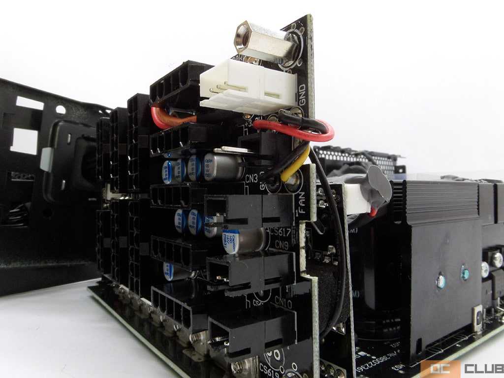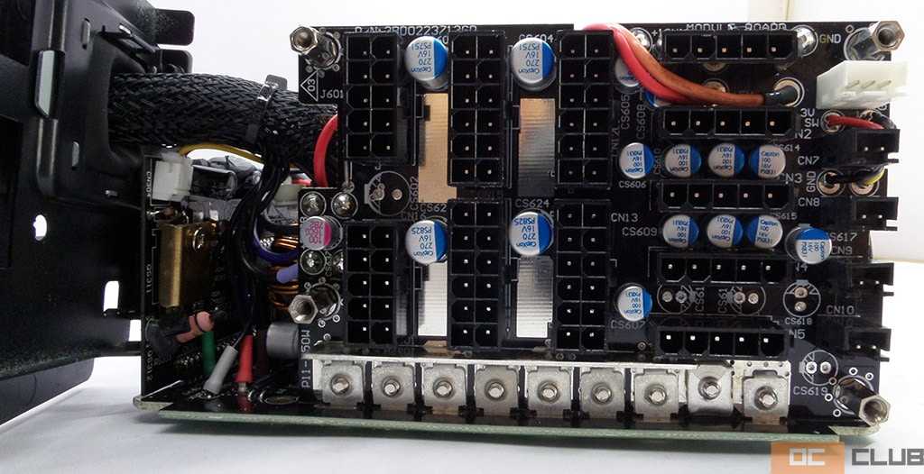 Не поскупились на фильтрующие конденсаторы на панели с модульными разъёмами. Для каждого разъёма как минимум по одному конденсатору, при чём довольно большой ёмкости (16 В, 3300 мкФ, 105°C). Питание на эту дочернюю плату подаётся через толстые шины, а не гибкие проводники.