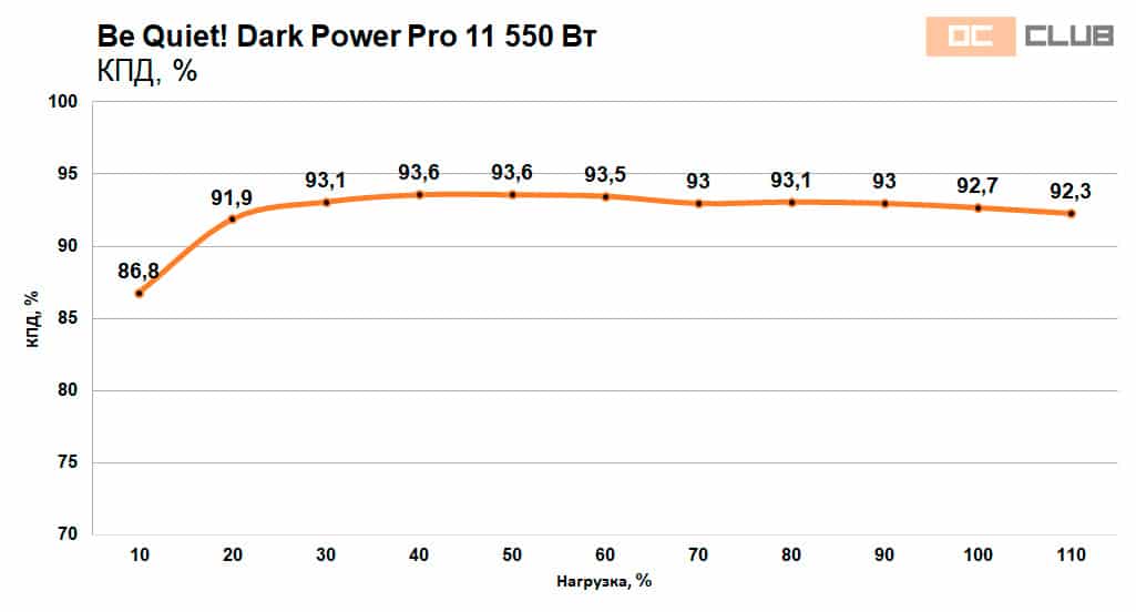 При активации “оверклокерского режима” все линии 12 В объединяются в одну, а вместе с тем растёт допустимая токовая нагрузка. В таком режиме блок выключился по защите при нагрузке 56 А, что на 10 А больше заявленного значения. В целом, для Platinum-блока мощностью 550 ватт выдержать ~670 Вт нагрузки – это неплохо, но показатель не выдающийся.