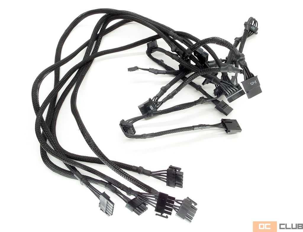 Набор кабелей впечатляет. Все они набраны черными проводами калибра 16AWG и 18AWG, заключенными в нейлоновую оплетку. Края оплетки зафиксированы на стяжки и термоусадку.