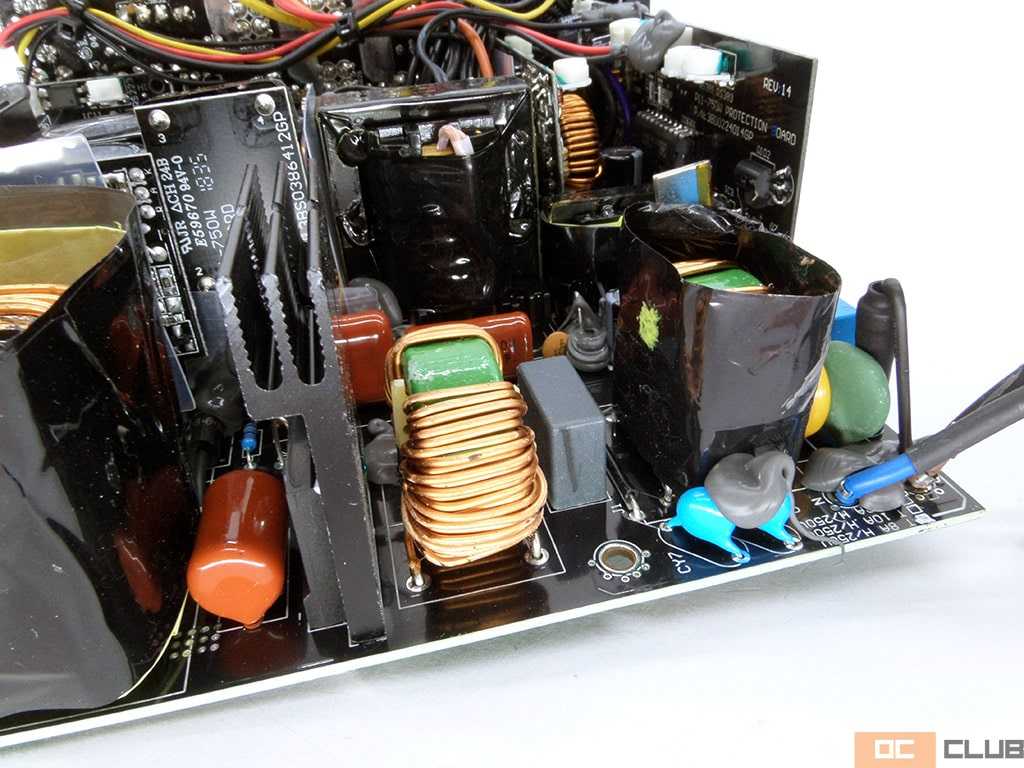 Часть входного фильтра распаяна непосредственно на вводной розетке, а оставшиеся компоненты уже на основной PCB, что в последние годы стало негласным стандартом топовых блоков питания.