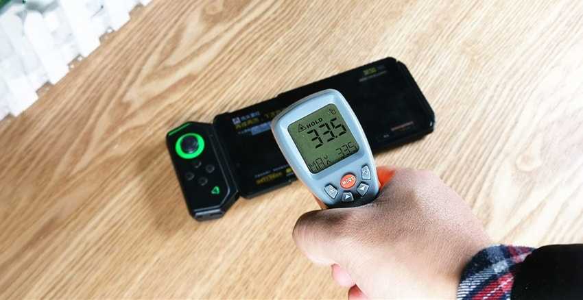 Мы играли в PUBG в течение получаса, чтобы проверить как нагрелся Black Shark Helo спереди и сзади. Температура на передней панели в среднем составила 33 градуса (34 градуса по центру). Самая высокая температура была в правом верхнем углу задней панели смартфона, там устройство нагрелось до 36 градусов. Тепло хорошо рассеивается по корпусу и в среднем держится на отметке в 34 градуса, что обычно не ощущается пользователями.