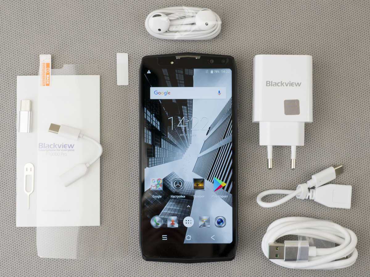 Небольшие китайские компании понимают, что если уж и просить за свой смартфон большие деньги – то класть в коробку как можно больше аксессуаров. В комплектацию обоих девайсов входят защитные кейсы, защитные плёнки, зарядные устройства 5 В / 5 А, USB-кабели, провода OTG, переходники 3,5 мм -> Type-C и microUSB -> Type-C, наборы документации и иголки для извлечения лотков SIM. Покупатель Blackview P10000 Pro также получит наушники и ещё одну защитную плёнку, наклеенную на экран на заводе.